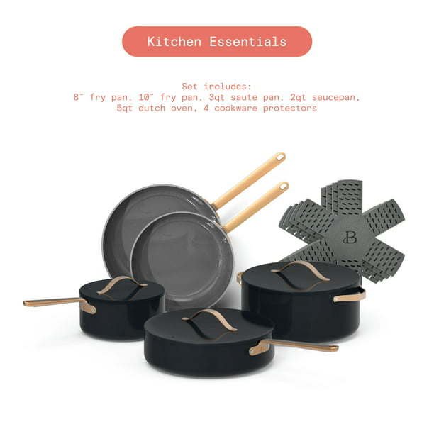 12pc Cookware Set, White Icing, by Drew Barrymore Free from Forever Chemicals: Made with non-toxic, healthy ceramic non-stick coating that is PTFE, PFOA & PFOS free Durable construction for fast and even heating Sleek design with gold die cast handles Flat die cast lids for cohesive look and cooking control Oven safe up to 500°F, including die-cast lids Dishwasher safe, handwash recommended Compatible with all stovetops including induction 12 piece cookware set includes: 8' fry pan 10' fry pan 3qt saute pan 2qt saucepan 5qt dutch oven 4 cookware protectors